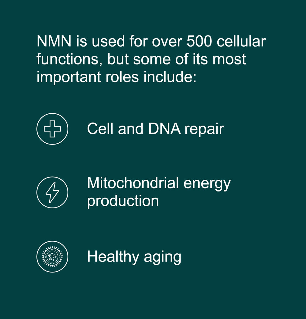 “NAD+ is an energy-providing molecule found in every cell of the body. It is used to metabolize, build new cells, defend against free radicals, and send signals inside the cell. Regular supplementation with NMN supports healthy levels of NAD+”