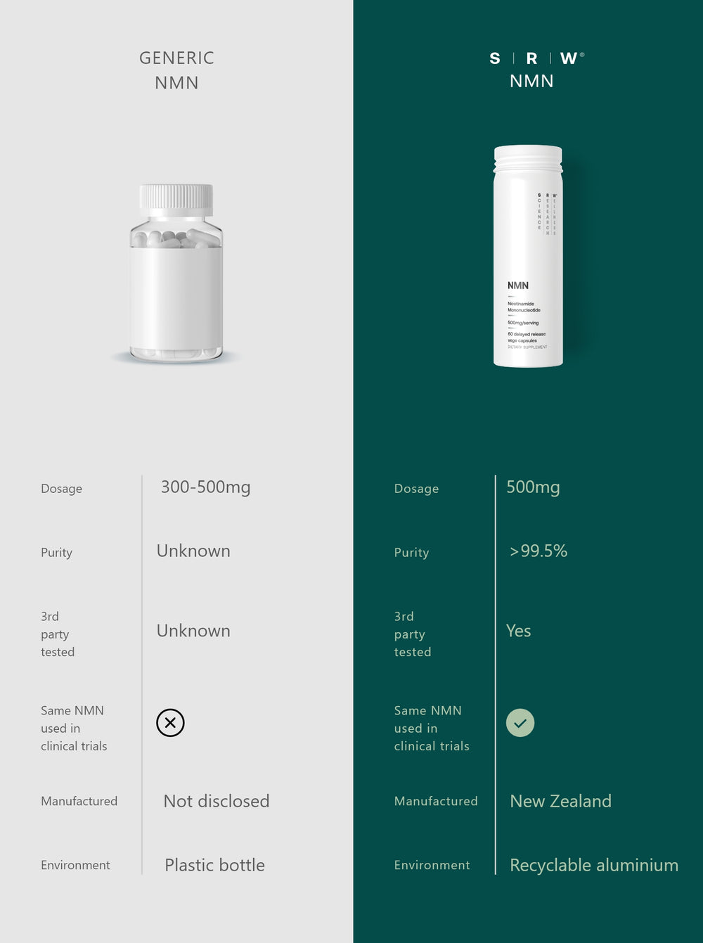 “At SRW, we never compromise on the quality of our ingredients. Our product contains a high dose of 500mg per serve at an optimal purity of over 99.5%. NMN enters directly into the cell through a recently discovered transporter, where it is converted to NAD+ in one step.”